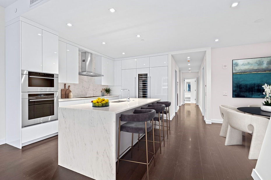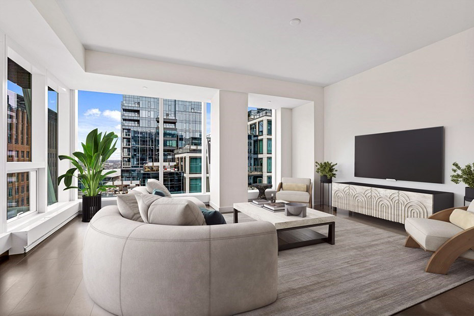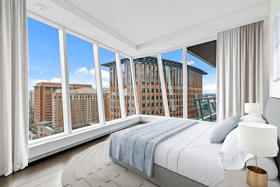 The luxury residences at St Regis Seaport offer a blend of elegance and modern living, making them an attractive choice for discerning buyers seeking a truly high-end urban lifestyle. Designed by Elkus Manfredi Architects and built by Cronin Development it features floor-to-ceiling windows, state-of-the-art appliances, and top-of-the-line finishes. The residences range in size from one-bedroom to four-bedroom penthouses. All units feature private balconies or terraces with stunning views of the Boston Harbor, the Seaport and Boston’s downtown city skyline. Its sleek façade is characterized by clean lines and the building’s unique design was inspired by sails to fit graciously alongside the piers and surrounding waterfront. The property also offers sophisticated communal spaces including lounges and social areas where you can connect with fellow residents or find a quiet corner to relax. The outdoor terrace provides an oasis in the heart of the city, with lush landscaping and comfortable seating areas, offering a refreshing escape from the urban hustle. The bathrooms feature a combination of high-end fixtures, sleek tiling, and refined finishes. The kitchens in these condos are a harmonious fusion of functionality and aesthetics.